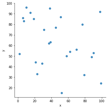 We will create a scatterplot from the dataset created in Pandas, calling x and, indicating the dataset as df and using False in the fit_reg parameter because we want only the data points, without regression line: