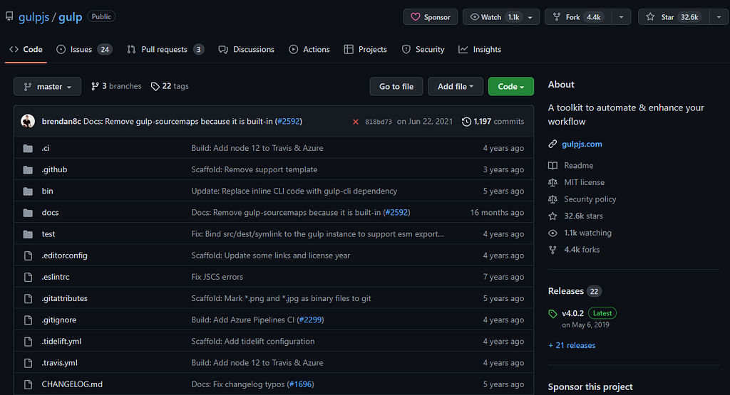 To evaluate the software, you can see how often it is updated. If the tool is constantly being worked on, errors are corrected in it, then it will turn out to be of higher quality. Looking at the Github repositories of Grunt and Gulp, we can get an idea of the level of developer activity. Commits occur every time the code has been updated.