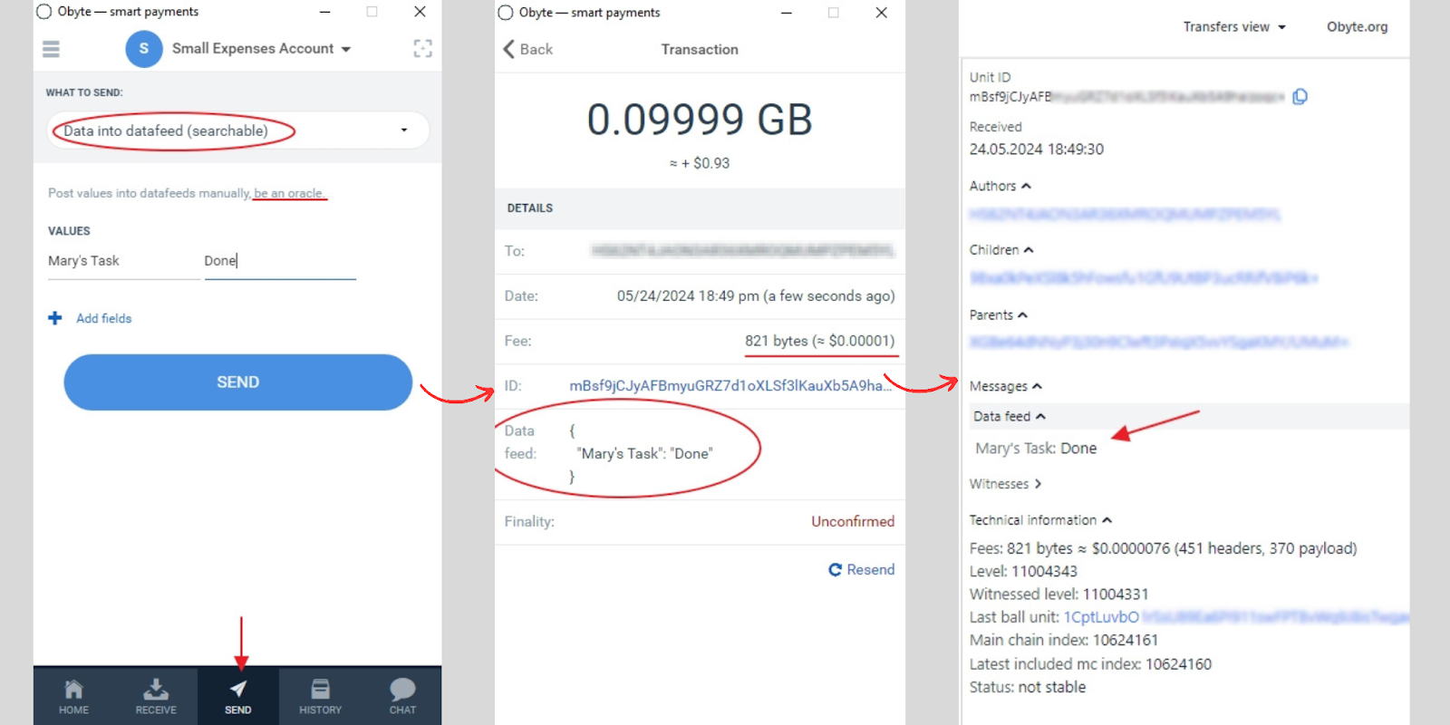 \ Beyond this, you’ll only need to fill the values of your data feed (oracle) in any way you want, including a name/title, and a result/answer. For instance, the name could be “Mary’s task,” and the result could be “Done.” Press “Send,” type your password if required, and that’s it! A small transaction fee will be taken from your wallet, and the oracle will be published on the Obyte DAG, available for everyone to consult —including smart contracts.