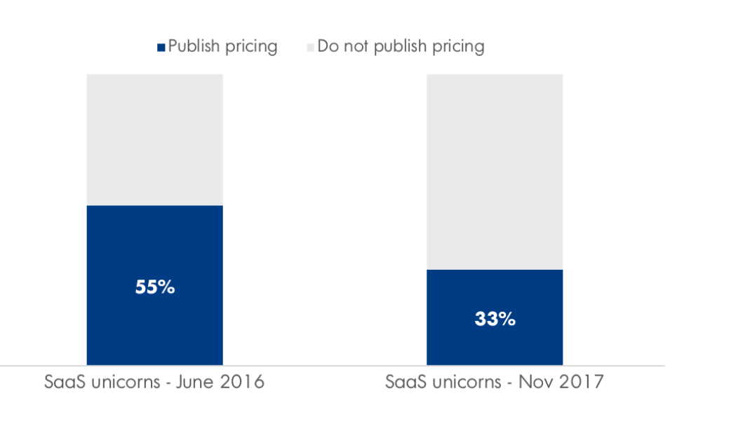 \ The SaaS industry saw a notable decline in price transparency between 2016 and 2018. In June 2016, a study showed that 55% of private (see chart above) SaaS unicorns published their pricing online. By 2018, this figure dropped to 47%. Even worse, new unicorns like Zuora and GitHub were less transparent, with only 21% disclosing their prices.