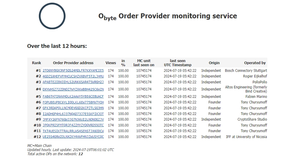 \ The Obyte network has space for 12 OPs, and all of them should be approved by a majority vote of the community. Currently, there are seven Order Provider nodes controlled by independent parties, and five still controlled by the founder (Tony Churyumoff), in the absence of adequate candidates. Of course, the more independent parties in the game, the more decentralized Obyte would be.
