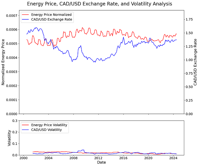 \ Alternatively we can look at energy compared to the Canadian dollar, which is historically stable when traded with the US Dollar. In this example, energy has a lower volatility. The stable prices of energy demonstrate how an Energy Dollar offers a more consistent reference point than a single fiat currency.