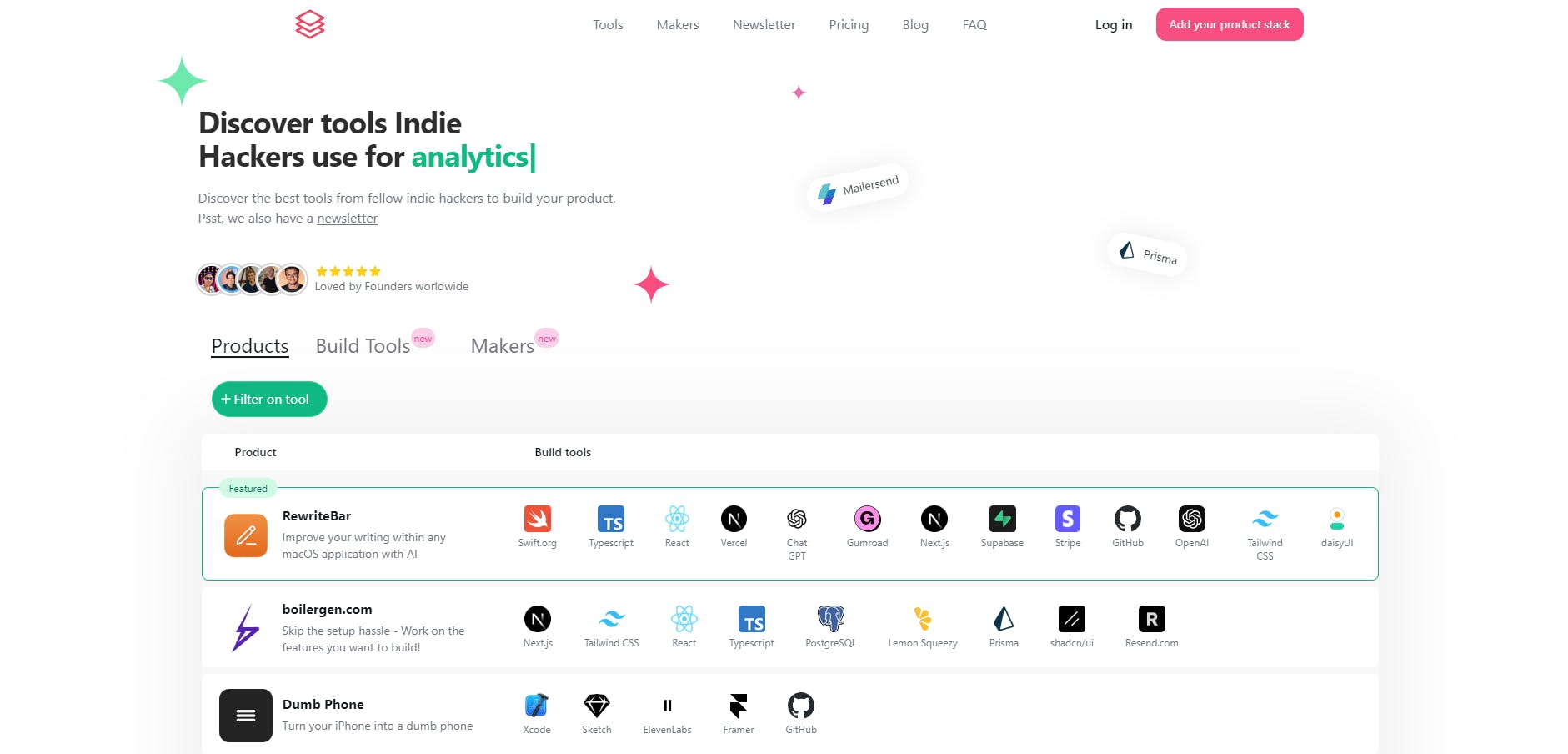 This tool provides real-world examples of tech stacks used by successful indie hackers. It lists the technologies and tools they used to build their SaaS products.