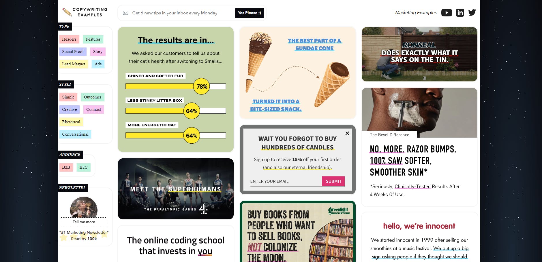 This resource provides a collection of high-performing copywriting examples from successful SaaS products and campaigns.