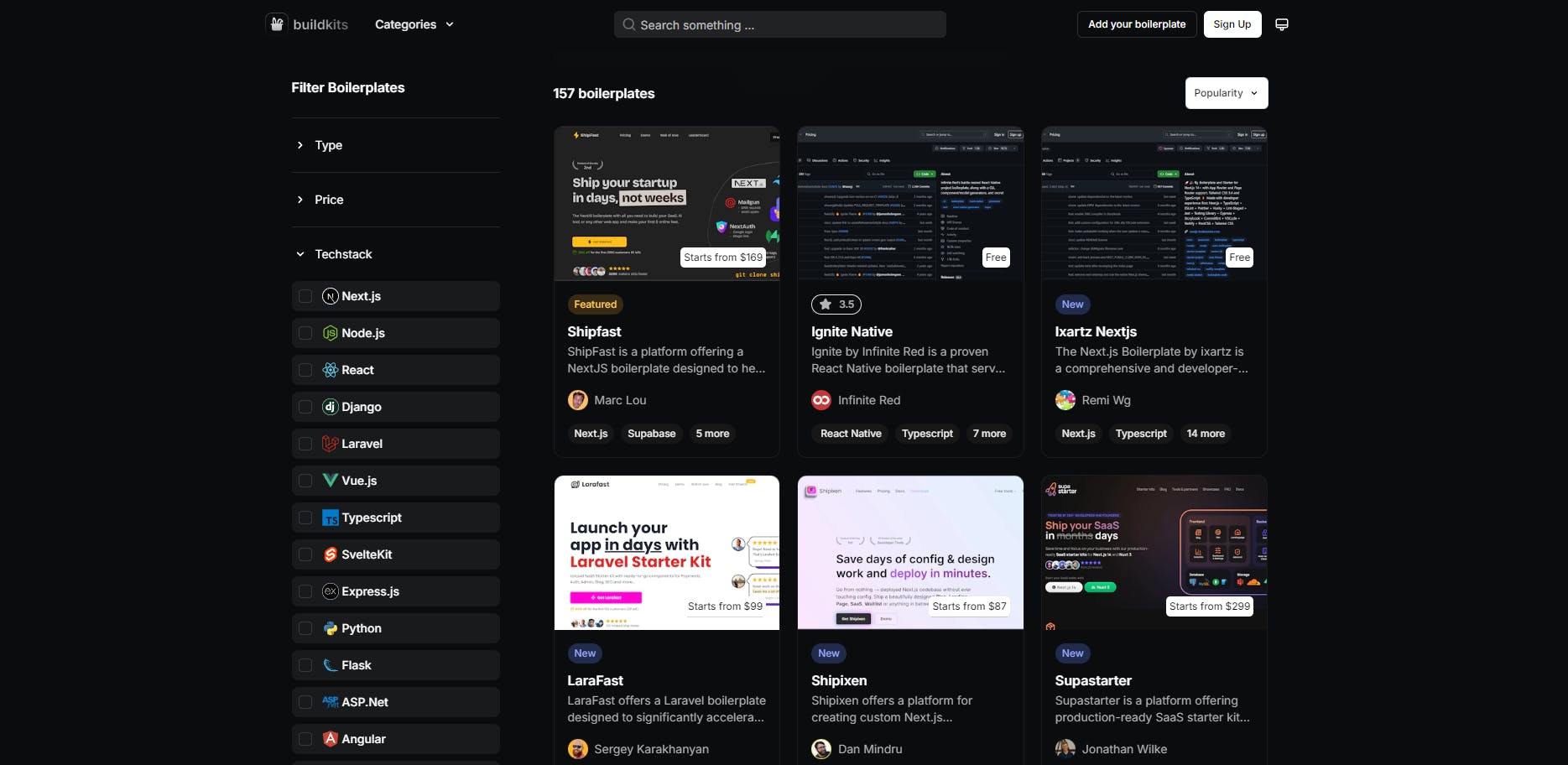 BuildKits offers a variety of code boilerplates tailored for different types of tech stacks.