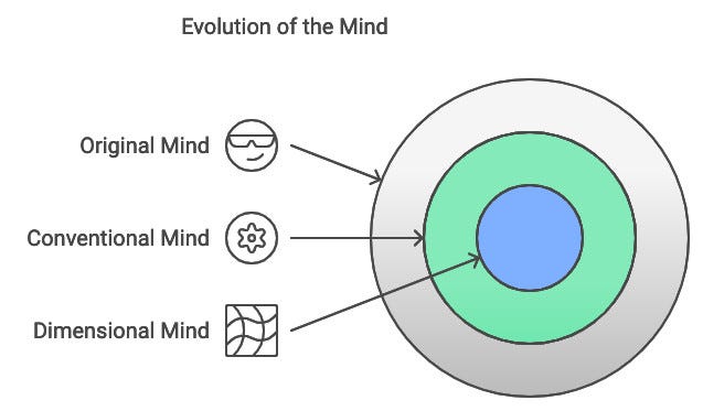 The mind is a complex aspect of human nature. Its evolution from childhood curiosity to adult convention and ultimately to creative mastery defines how we perceive and interact with the world around us. These stages — known as the Original Mind, the Conventional Mind, and the Dimensional Mind — shape our capacity for creativity, adaptability, and growth.