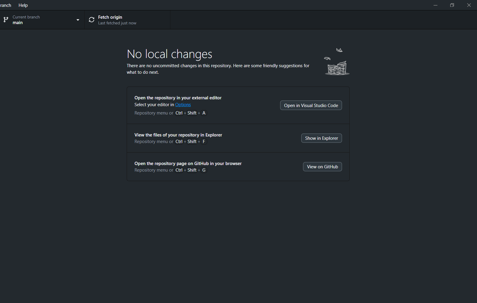 !GitHub Desktop 'No local changes' starting screen for newly cloned repo](https://dev-to-uploads.s3.amazonaws.com/uploads/articles/5xp9dplhlfugmh5yx3rn.png)