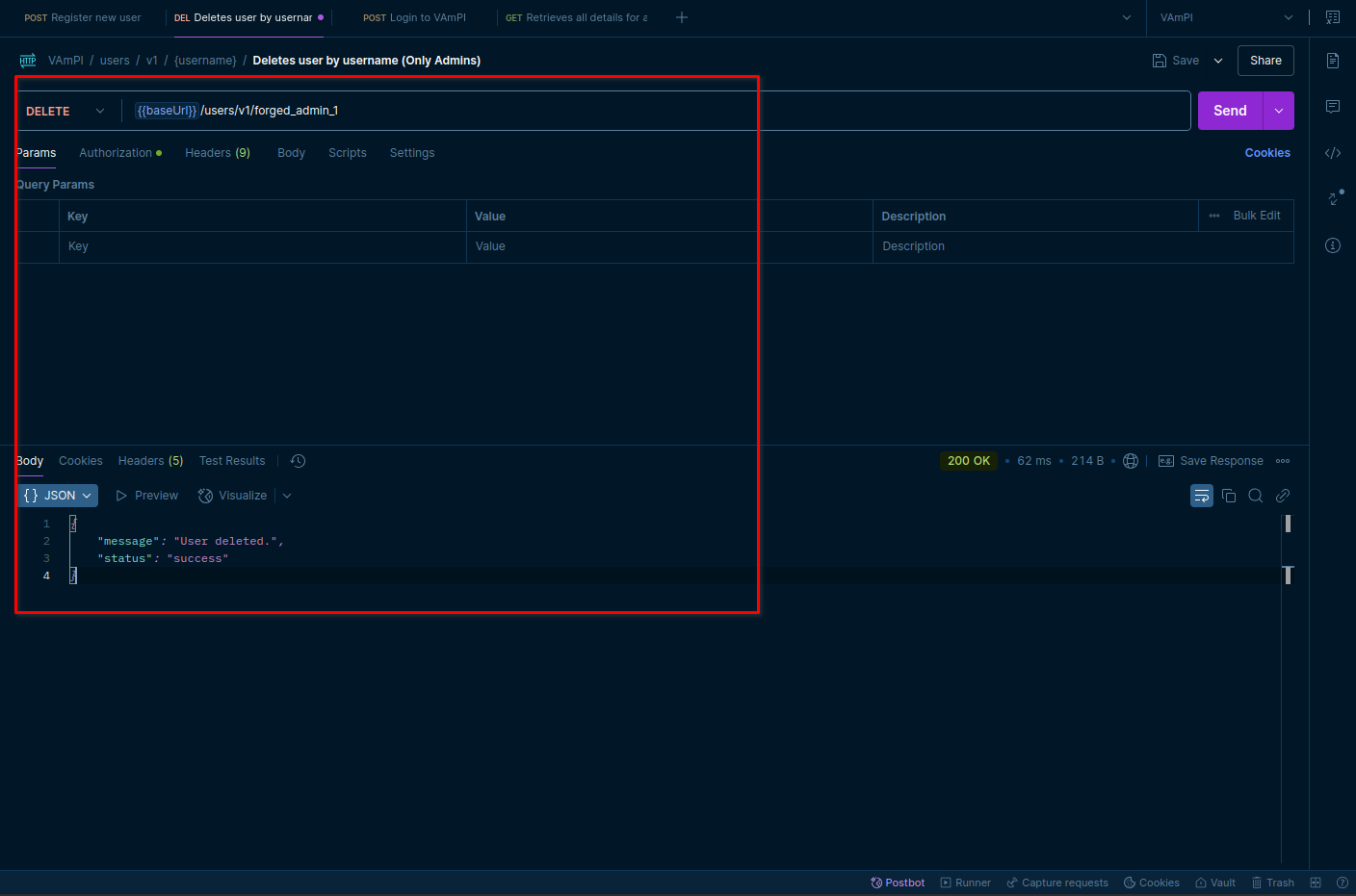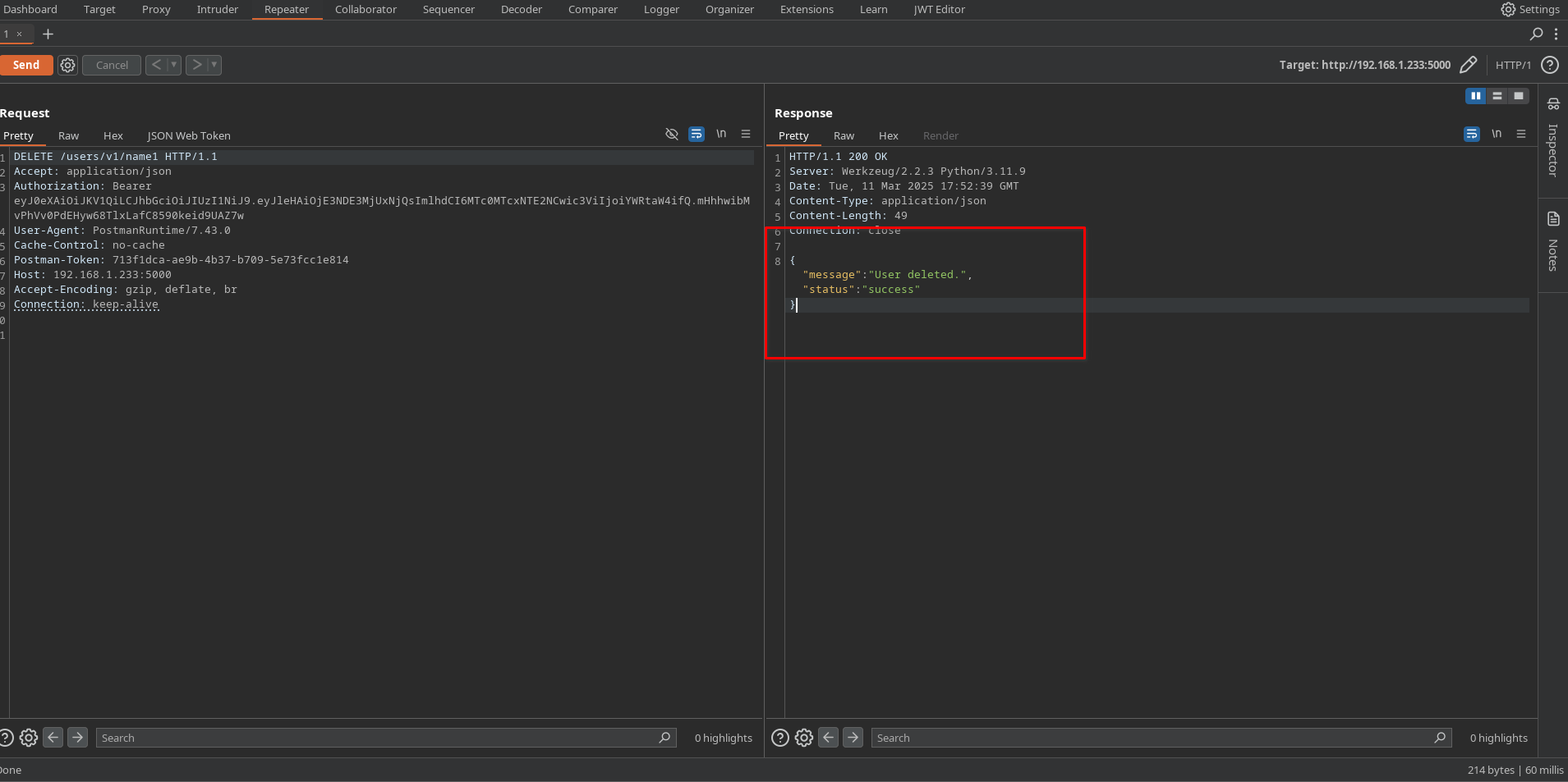 \ The Backend Story Say we have created a user called forged_admin. Would we be able to delete a user with its token ?The answer is no. Because the app only allows a user named admin to delete it, line 212.