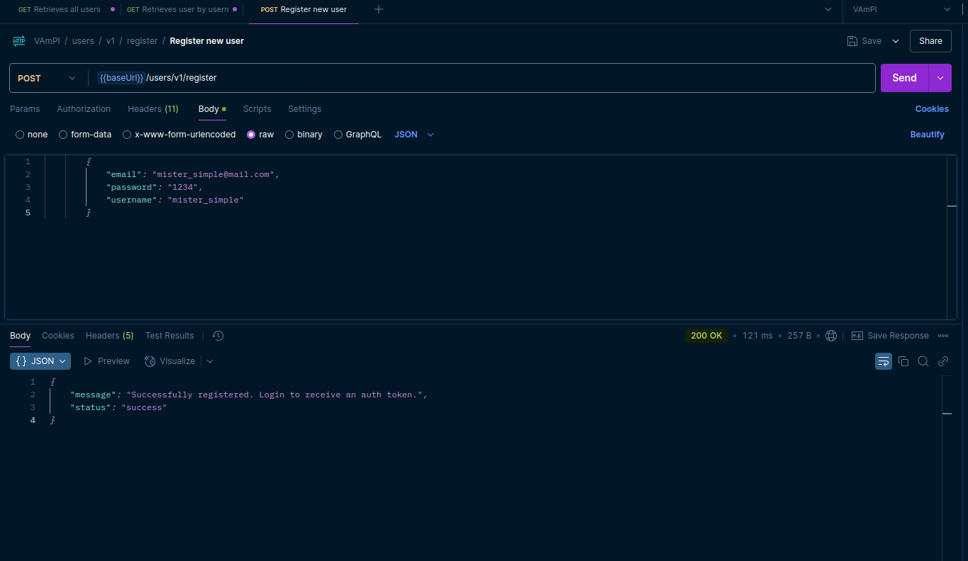 We assume that the VAmPI application's API endpoints have already undergone rigorous exploratory testing- we know their business logic, we know how to interact with them, and we know how they react on success and failure, we know how they are coupled with each other.