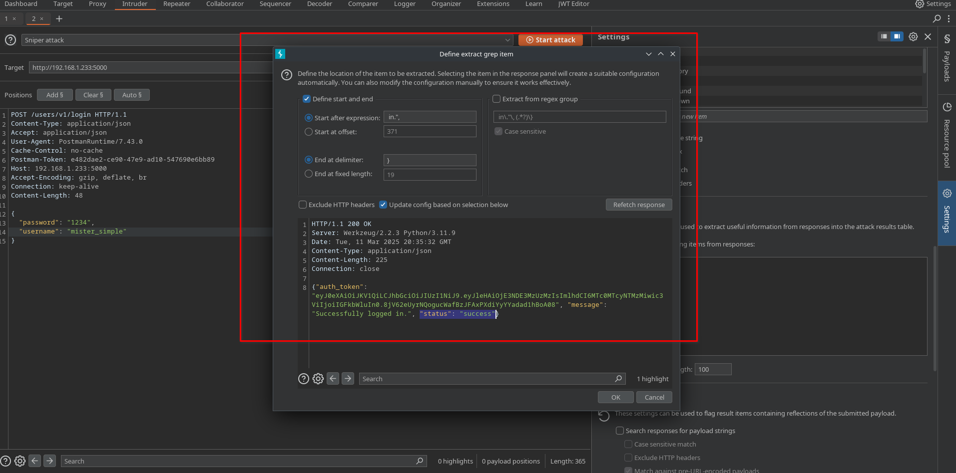 - Select regex for the success message. This is an excellent handy feature of Burp that one need not to write own regex also an advanced user can modify the added regex.