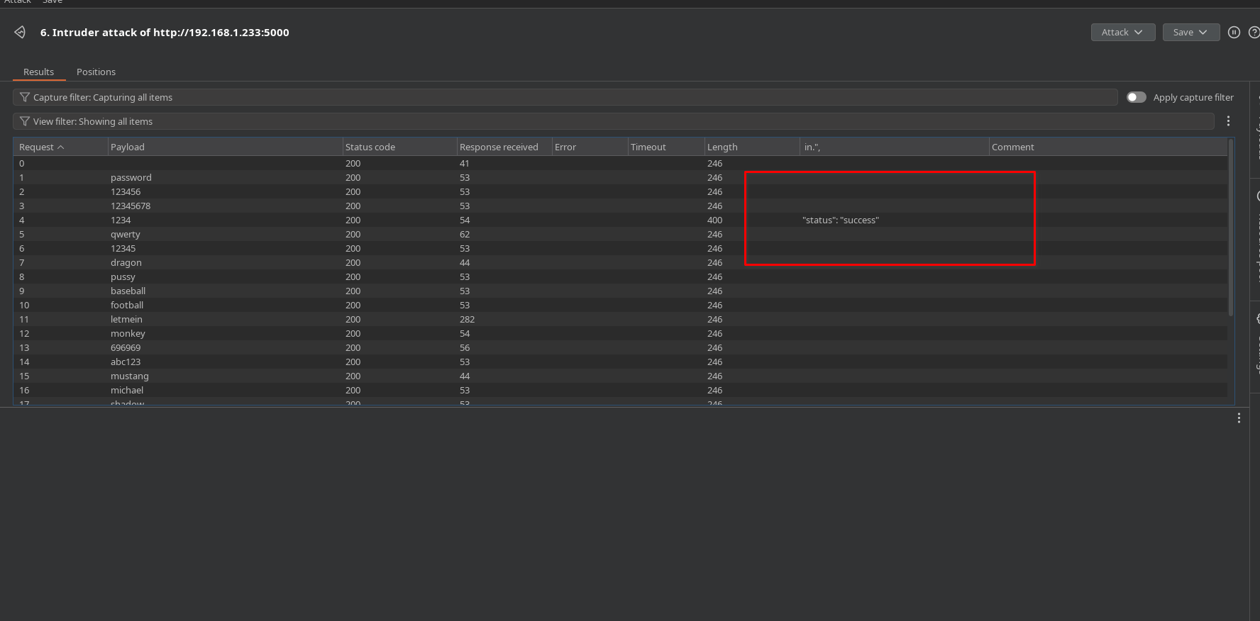 \ Note: We could pause the the bruteforce in Burp intruder settings after getting the success message.