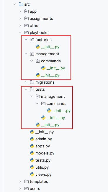 Step 1. Inside the playbooks app, create the following new packages: factories, management, and tests.
