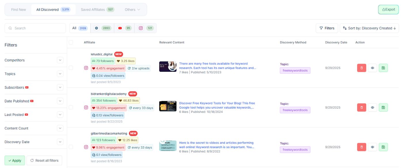 AffiliateFinder.ai is the best tool for finding affiliates and influencers currently promoting your competitors, or big influencers in your niche, so you can recruit them as partners.