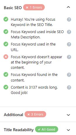 As you create content, RankMath gives you specific suggestions: add your target keyword to the first paragraph, include more internal links, optimize your meta description length, and more.