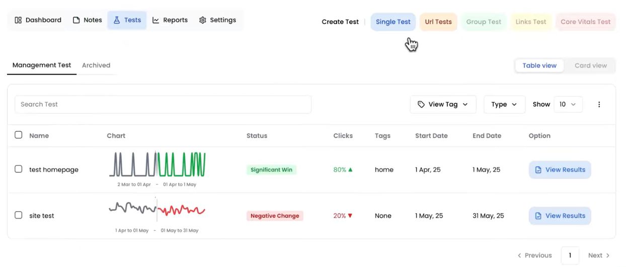 Another feature I’ve found really useful is the SEO testing. It lets you set up A/B tests and view the results so you can make decisions based on real data, not opinions.