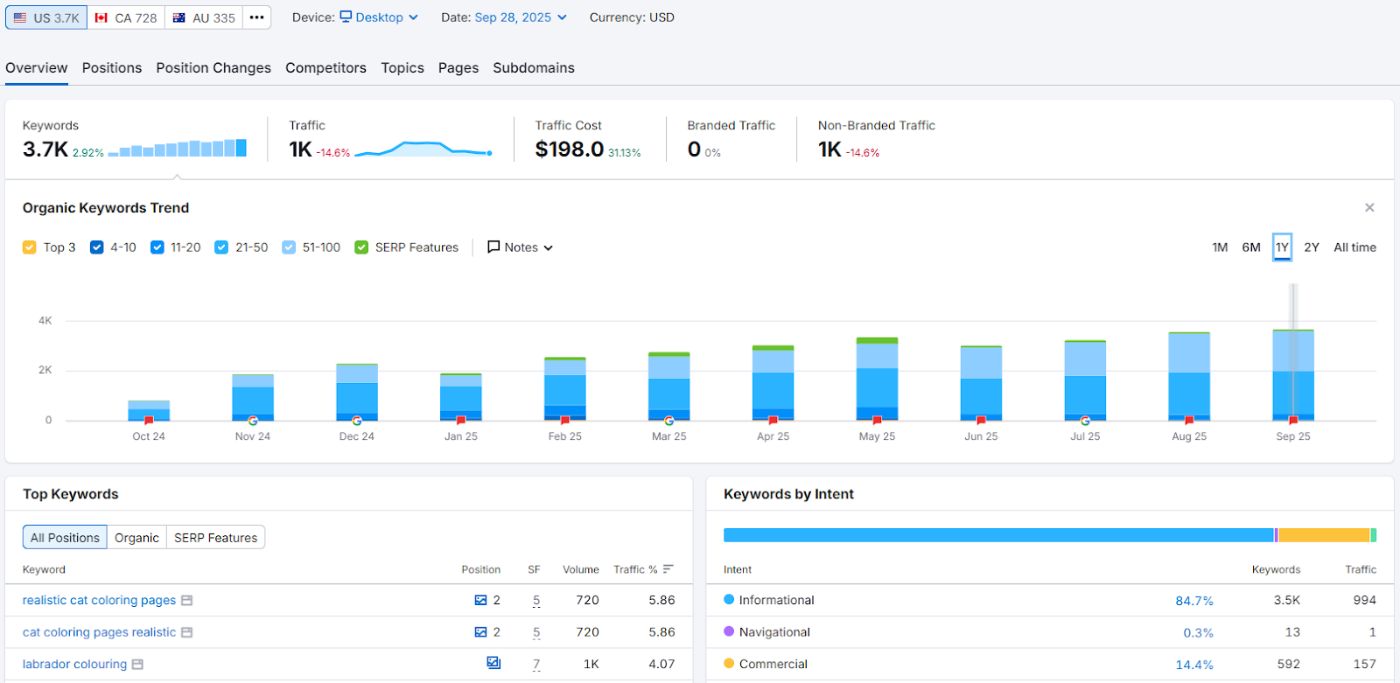 The competitive analysis is a particularly strong feature of Semrush, showing exactly which keywords your competitors are ranking for, how much traffic those keywords are driving, and how difficult it would be for you to compete for those same terms.