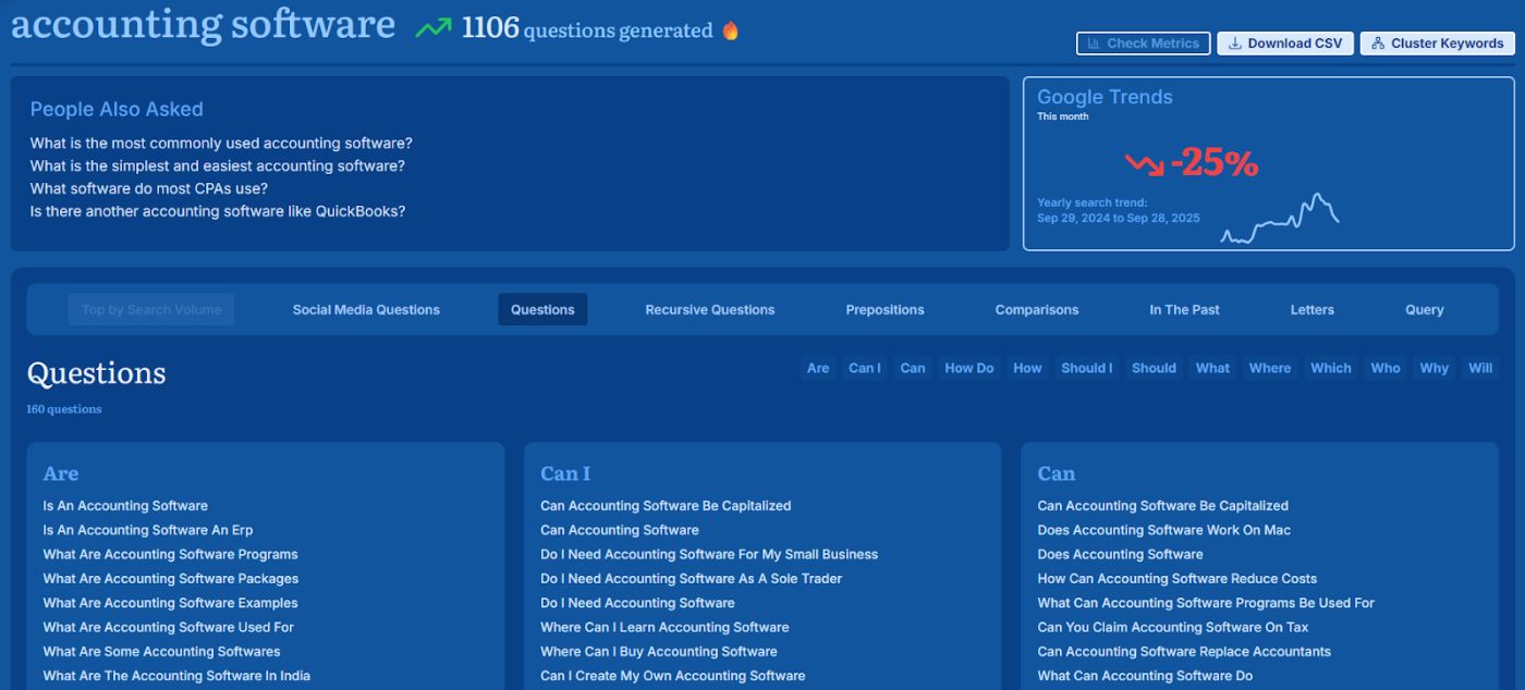 Answer Socrates aggregates data from Google Suggest, People Also Asked boxes, and Google Trends to give you a comprehensive view of search queries.