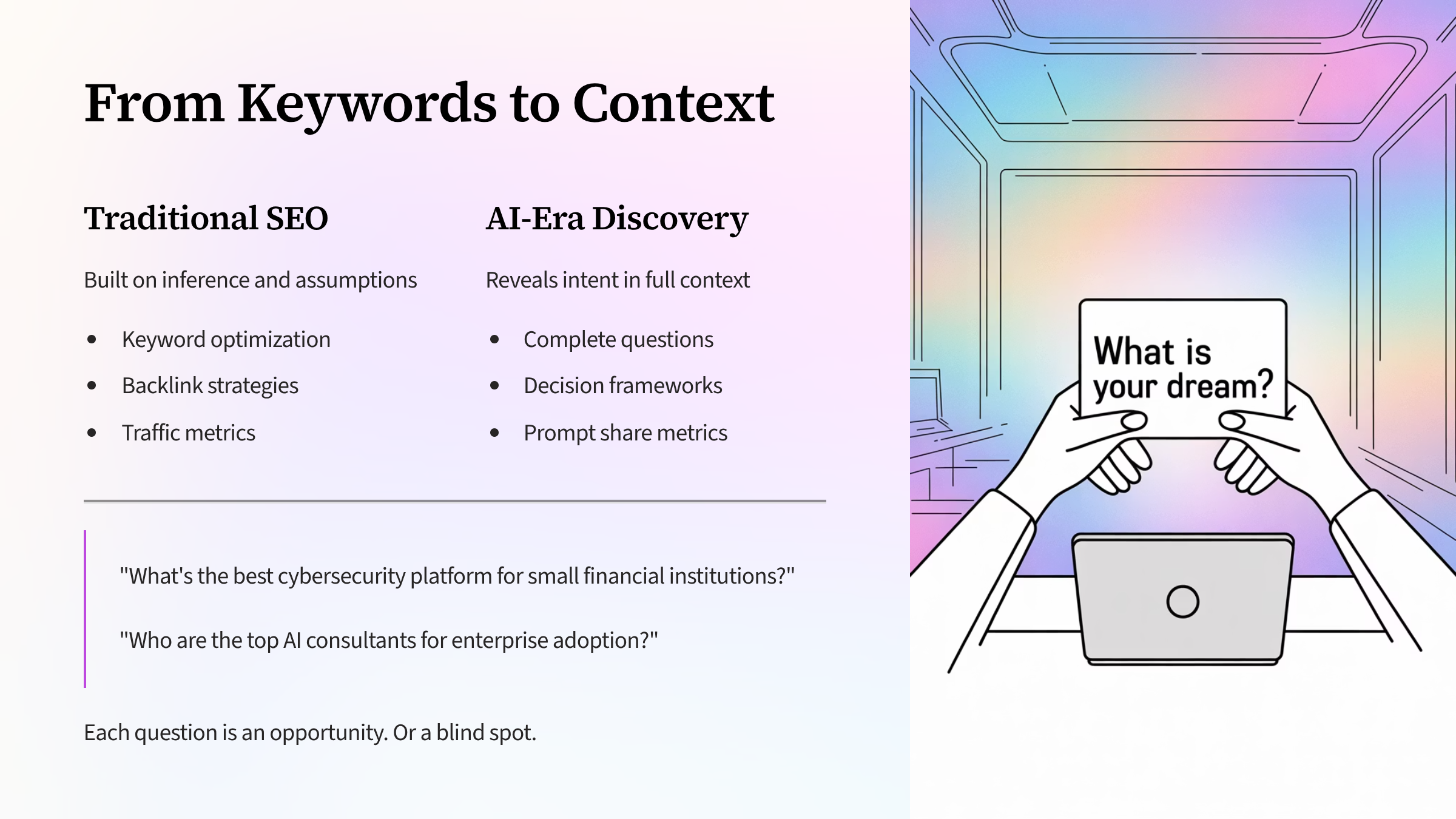 But prompts — the way people now speak to AI — reveal something deeper. They show intent in full context: the problem, the comparison, and the decision.