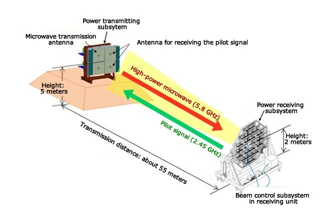 \ The solar energy collected is changed into microwaves to be sent wirelessly to Earth. This happens at frequencies between 2.45 GHz and 5.8 GHz to reduce atmospheric absorption and avoid disrupting current communication systems. The microwave beam is precisely aimed using phased array antennas, forming a narrow beam that sends power to specific receiving stations. The beam's strength is carefully managed to keep it safe for aircraft and wildlife that might cross its path.