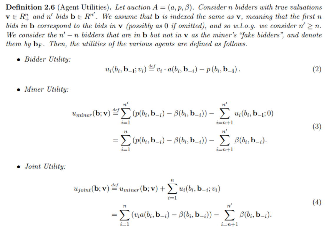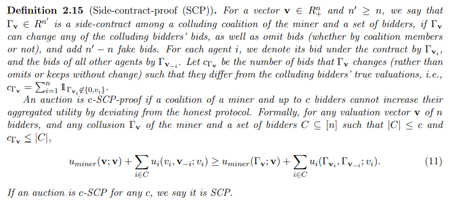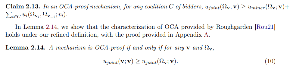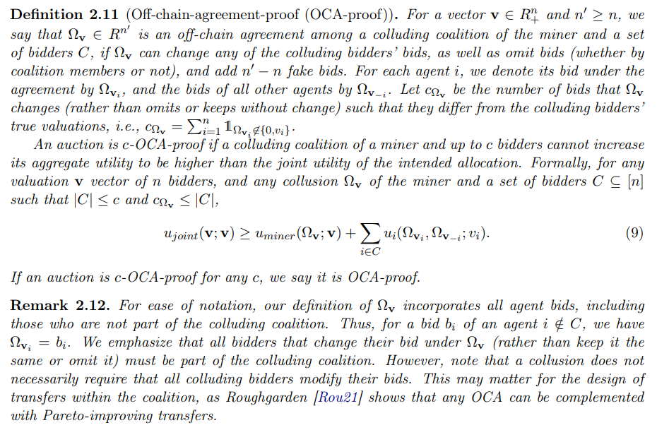 \ The OCA-proofness notion, introduced by Roughgarden [Rou21], compares the colluding coalition with the coalition comprised of the miner and the winning bidders of the canonical outcome, produced by following the mechanism’s intended allocation. The traditional definition given by [Rou21] does not include a c identifier for the amount of bidders in the coalition, but we add it since it allows considering how explicitly well-coordinated the collusion has to be in order to succeed.