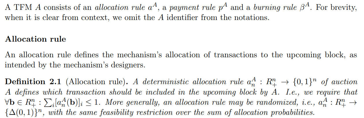 We follow the standard model used by the literature for TFMs [LSZ19; Rou21; Rou20; CS23; SCW23]. The main technical assumption we make, which we use to simplify the discussion, is that the auction is a single-item auction, i.e., that the block size is 1. We interchangeably use the terms auction, mechanism, or TFM to refer to the object of our discussion, depending on what is most appropriate in the context. Some missing proofs are in Appendix A.