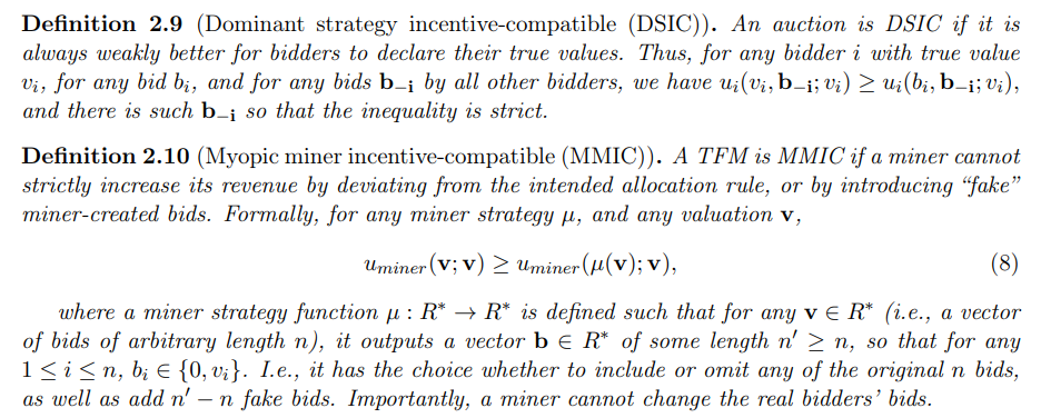 We now go over the literature’s standard desiderata for “good” TFMs, which includes the DSIC and MMIC properties. These properties are usually augmented by some collusion resistance notion, i.e., either OCA-proofness or SCP.