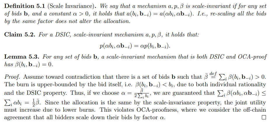 \ Corollary 5.4. By Lemma 5.3, a DSIC+OCA-proof scale-invariant mechanism does not burn fees (i.e., its burn rule is the constant zero function), while from Lemma 3.5 we get that a DSIC+MMIC+OCAproof mechanism has payments equal to the burn in the single bidder case. Therefore, we must have 0 payments in the single bidder case, and so, in the single bidder case, the item is either always or never allocated.