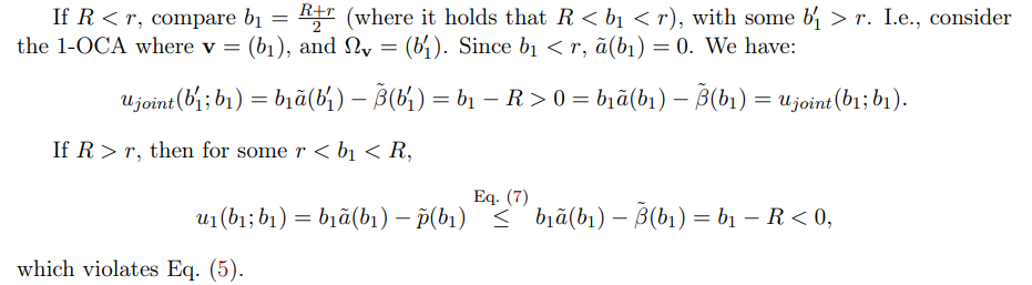 \ Lemma 4.4. Any 1-OCA-proof deterministic mechanism a, p, β is exactly of the following form: For some r ≥ 0, the mechanism allocates the item to the highest bidder subject to it having higher value than r, or does not allocate the item at all. Whenever allocated, the burn is exactly r. I.e.,