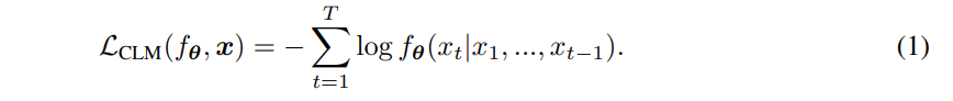 \ Language Modeling and Memorization In the causal language modeling (CLM) objective, a parameterized model fθ is trained to estimate the conditional probabilities of each token in a sequence given its predecessors: p(xt|x) Specifically, we train fθ to approximate p using the CLM loss: