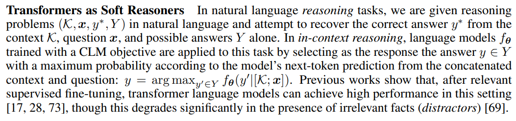 Notation We use f : X × θ → Y to refer to parameterised functions in which X is the set of possible inputs and θ are their possible weights (parameters). We use fθ : x 7→ f(x, θ) to easily refer to any f with a given set of parameters θ. We describe reasoning problems using tuples (K, x, y∗ , Y ) such that y ∈ Y is the correct answer for the question x given facts K, and use D to refer to sets of such problems. When it is clear from context, we drop Y and use only (K, x, y∗ ).
