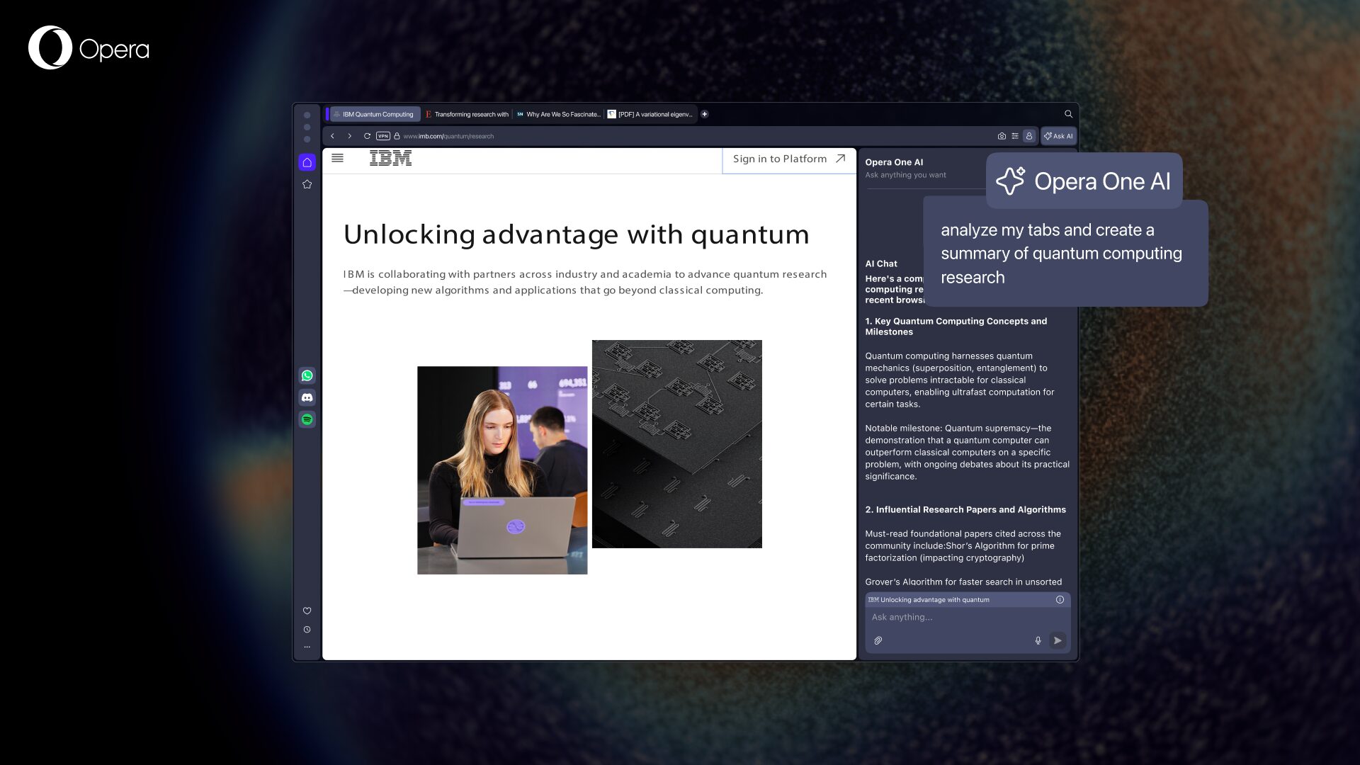 What if you have a Tab Island with many tabs open about research on the latest developments in quantum computing? Well, you can use Opera One AI to get the context and a compilation of the information presented in all the tabs within said Tab Island – this means the new Opera One AI can use all those tabs and combine their content to let you create something out of it.