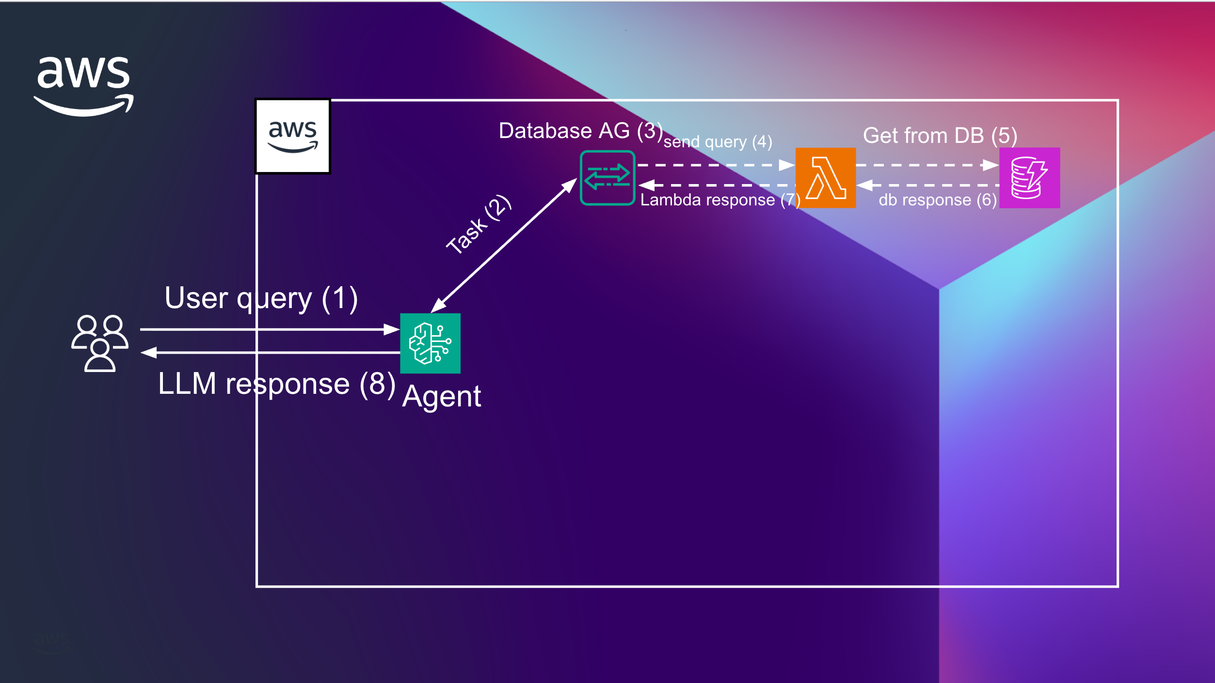 User makes a call to the Bedrock agent (1) with some task, let’s say, “how much of TVs do you have in stock?”. The agent knows by a defined prompt that if the question is related to checking stock status, they need to call (2) the “database“ action group (3, AG). In the database AG, we defined a lambda function to use (4), and this lambda will check the status in the DynamoDB table (5), get the response (6,7) and return the answer to the user (8).
