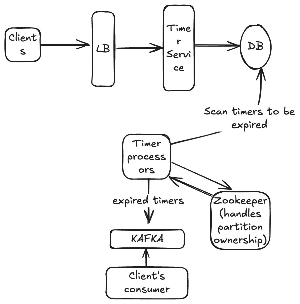 We built a distributed timer service capable of handling 100,000 timer creations per second with high precision and at least once delivery guarantees. The architecture separates concerns between a stateless Timer Service API (for CRUD operations) and horizontally scalable Timer Processors (for expiration handling). Workers scan their partitions for soon-to-expire timers (2-3 minute look-ahead window), load them into in-memory data structures for precise firing, then publish notifications to Kafka. ZooKeeper coordinates partition ownership among workers, preventing duplicate processing through ephemeral nodes and automatic rebalancing. DynamoDB provides the storage layer with a clever GSI design using time-bucketing and worker assignment for efficient scanning. Key innovations include temporal partitioning via time buckets, a two-stage scan-and-fire mechanism, ZooKeeper-based coordination, checkpoint-based recovery, and at-least-once delivery semantics.