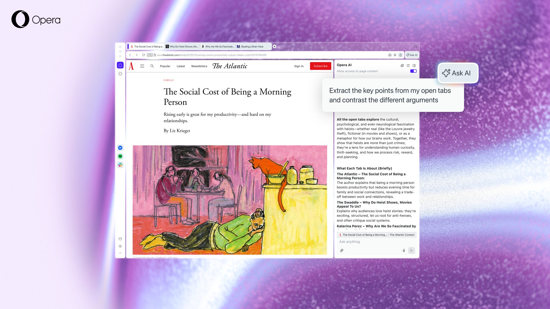 - After restarting your Opera browser, you will see an “Ask AI” button next to your toolbar → click on it and start exploring.