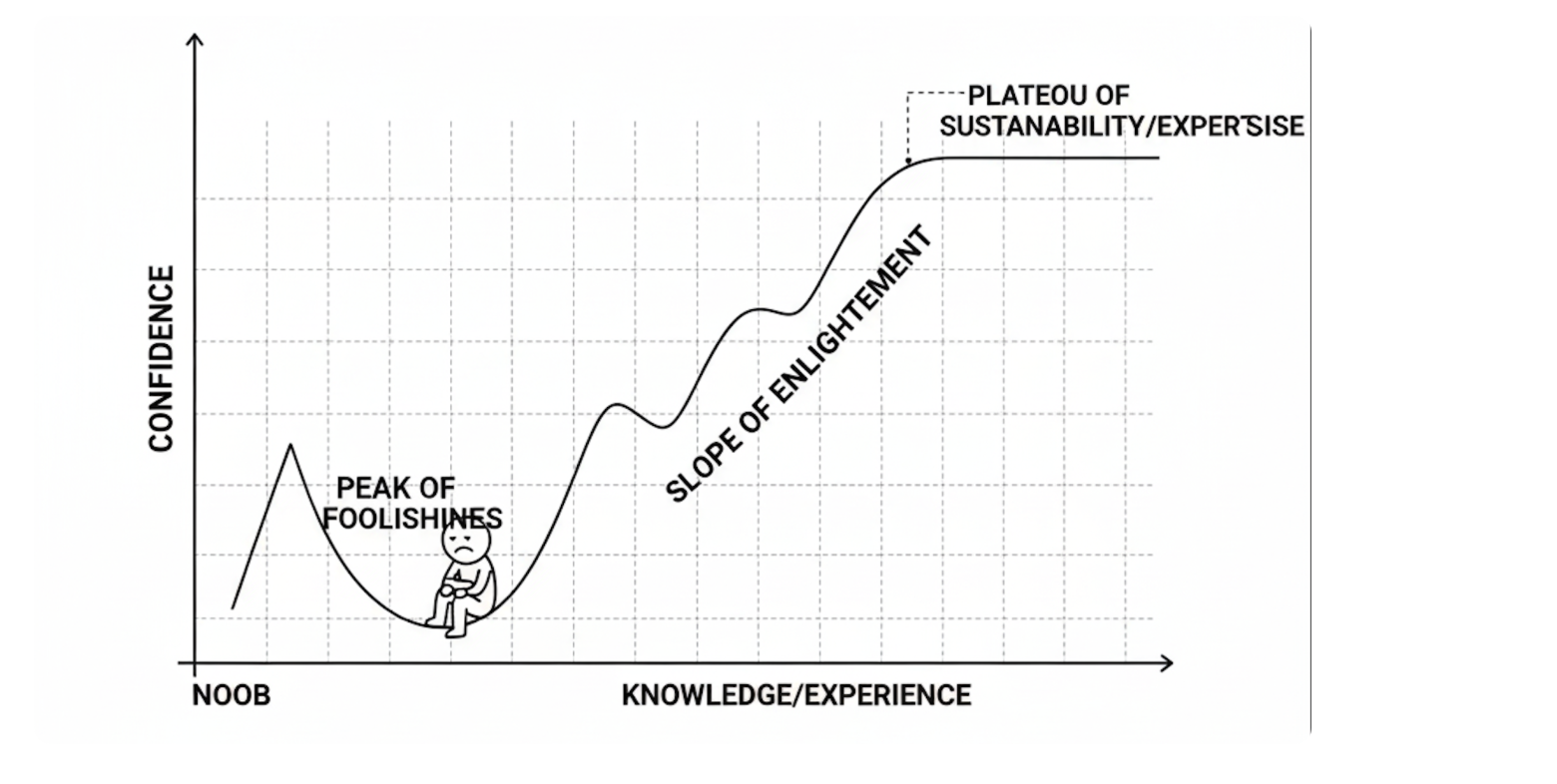 - Reversal — The Dunning-Kruger curve is a staircase more than it is an obstacle. Everyone climbs it: blind confidence, harsh reality, humble rebuilding, quiet mastery. The only difference is how long you stay stuck on each step.