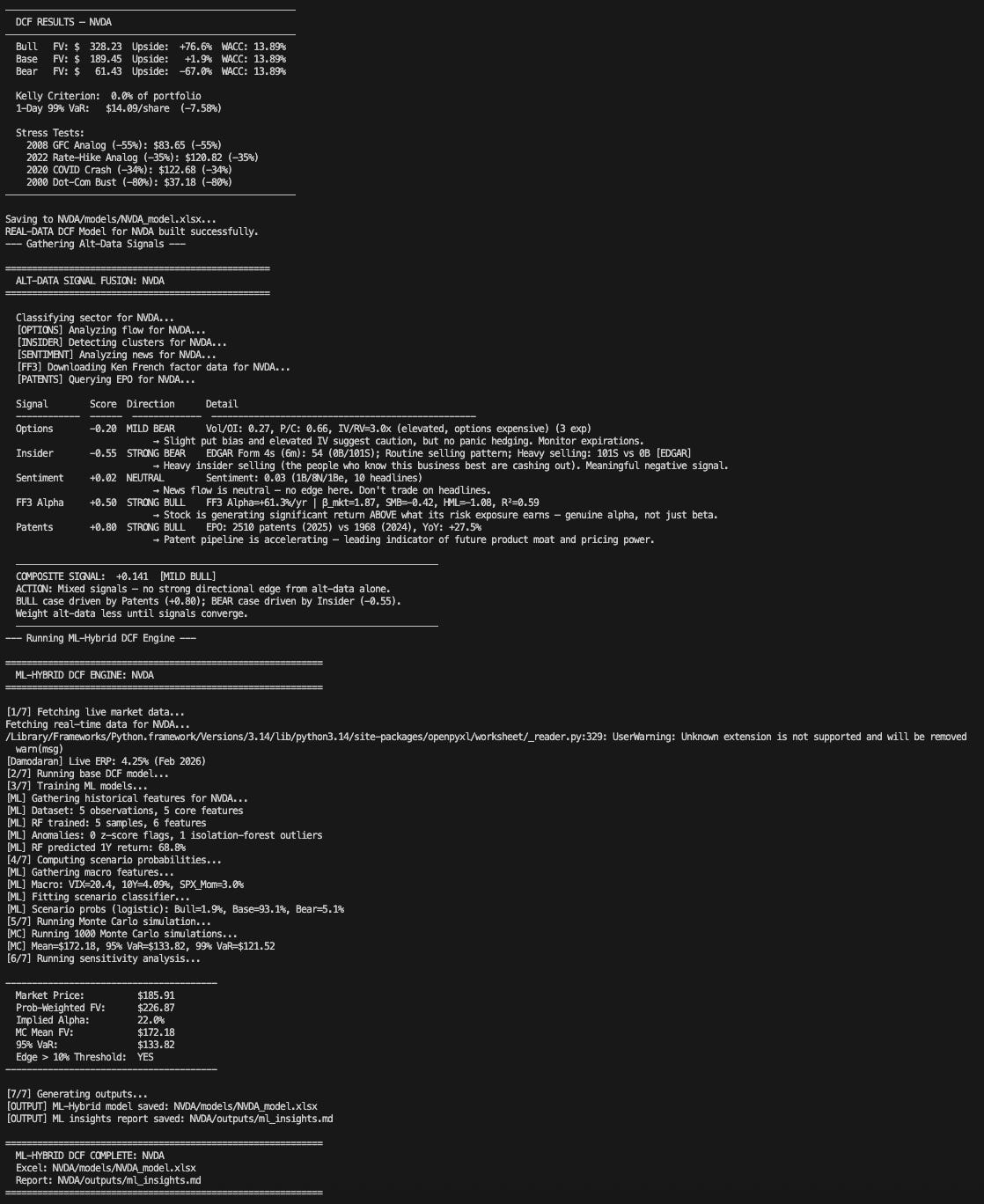 If implied alpha > 10%, the system flags it: ”EDGE > 10% THRESHOLD.” If it’s below -10%: ”OVERVALUED > 10%.”