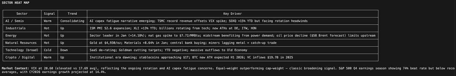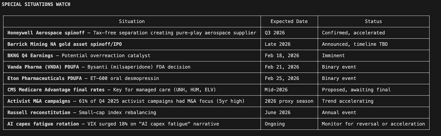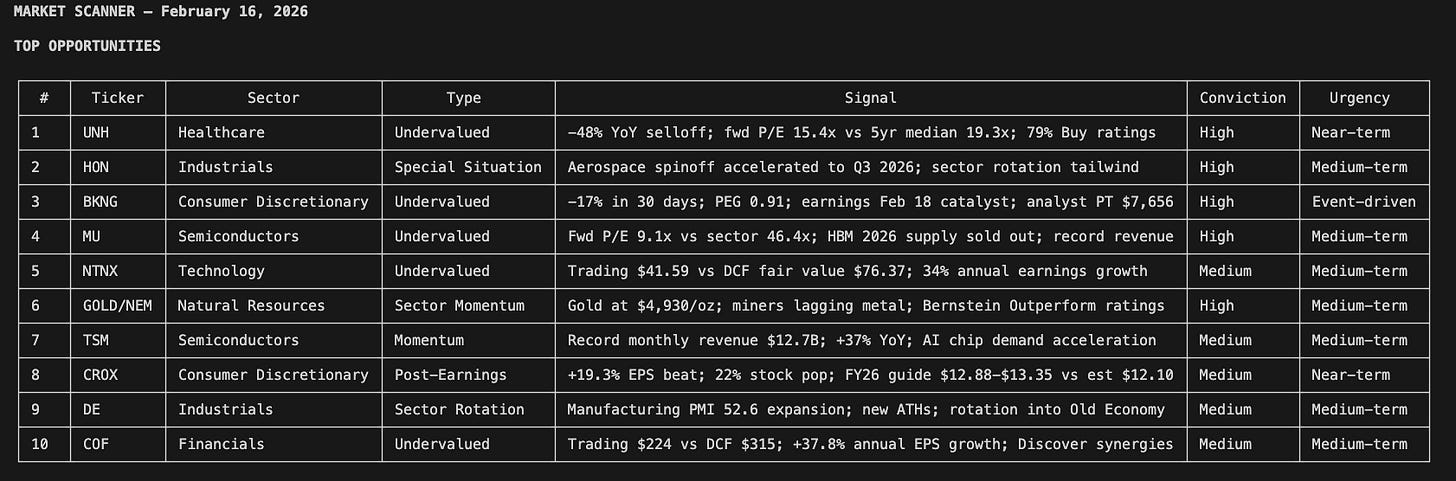Six sectors scanned. Valuation dislocations flagged. Special situations surfaced. Insider cluster buys detected. Every opportunity filtered through three quality gates: multi-source confirmation, identifiable catalyst, and quantifiable edge.