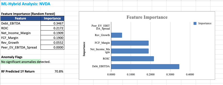Random Forest Model: A sort of decision-making engine trained on 10 years of quarterly financial data. It looks at six key factors: net income margin, FCF margin, revenue growth, debt/EBITDA, ROIC, and how the stock’s valuation compares to peers, and learns which of these factors have historically predicted returns for this specific company. It then tells you which factors matter most *right now*.