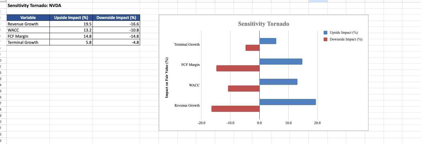 “Now run a 3-scenario DCF for NVDA. Use the current 10-Year Treasury yield as the risk-free rate, the stock’s actual beta, and a 4.2% equity risk premium. Project 10 years of free cash flow with growth decay, fast decay for hypergrowth, slow decay for mature. Give me Bull, Base, and Bear fair values, plus a 5×5 sensitivity table of WACC vs terminal growth rate.”