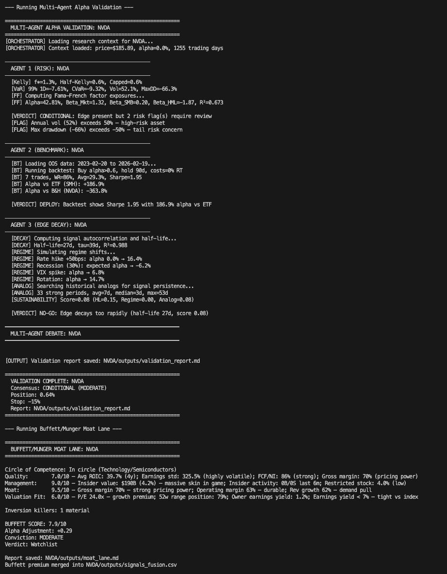 The three agents then debate. If 2 or 3 say DEPLOY, the system greenlights the position with sizing and stop-loss. If 2 or 3 say NO-GO, it kills the idea. CONDITIONAL verdicts get flagged for human review.