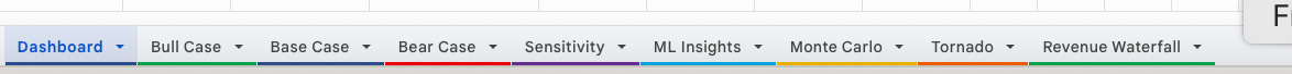 The output is a comprehensive Excel workbook with sheets for the Dashboard, Bull/Base/Bear Case, Sensitivity, ML Insights (with feature importance bar charts), Monte Carlo (with histogram), and a Sensitivity Tornado.