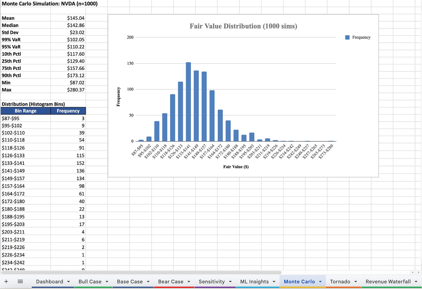 Monte Carlo simulations to stress the model across plausible inputs: Full DCF recalculated 1,000 times. Each simulation perturbs growth rates (±10%), WACC (±1pp), FCF margins (±2.5pp), and terminal growth (±0.5pp). The output is a probability distribution of fair values, with VaR at the 5th and 1st percentile.