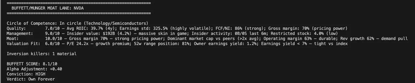 The output: a Buffett Score out of 10, an Alpha Adjustment (positive or negative), a Conviction level (HIGH/MODERATE/LOW/AVOID), and a Verdict (Own Forever / Watchlist / Pass / Avoid)