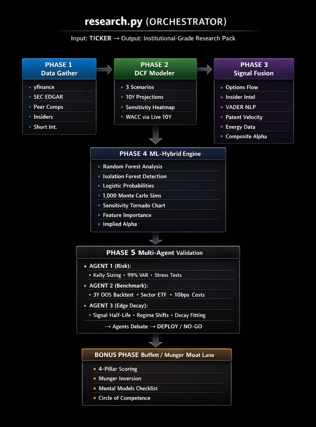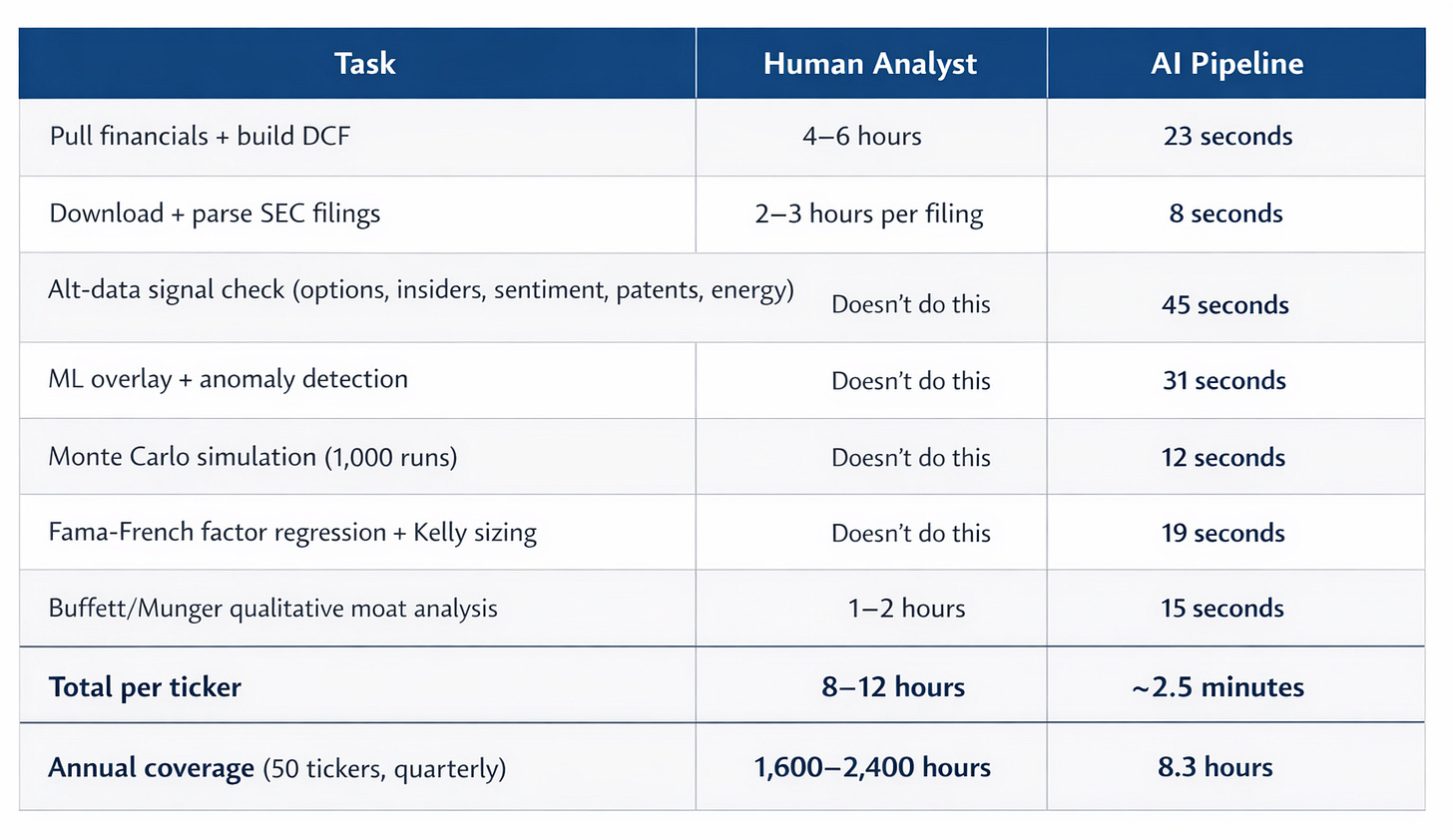 The difference between this and the full system? The full system does all of this automatically, adds Monte Carlo simulations, ML anomaly detection, multi-agent validation debates, and Buffett/Munger qualitative overlays, and it does it in 2.5 minutes instead of 30. But this manual version is a powerful starting point.